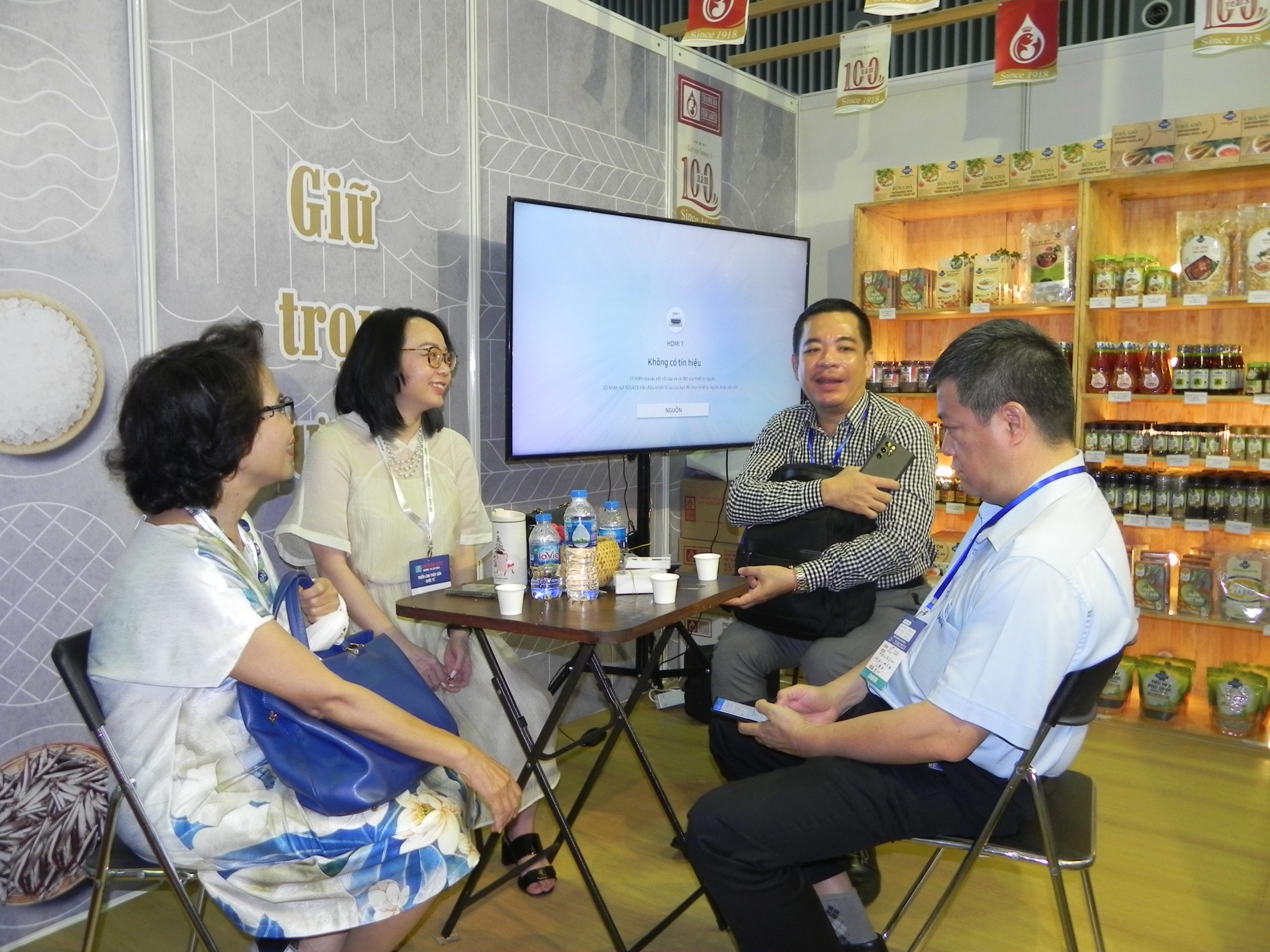 Bà Ong Thị Kim Ngân tiếp đối tác tại gian hàng nước mắm Thanh Hà